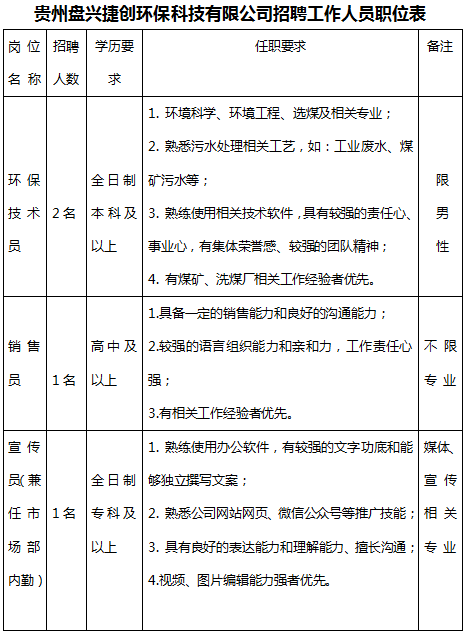 貴州盤興捷創(chuàng)環(huán)?萍加邢薰2021年面向社會公開招聘環(huán)保技術(shù)員2名,銷售員1名,宣傳員(兼任市場部內(nèi)勤)1名。具體招聘職位詳見《貴州盤興捷創(chuàng)環(huán)?萍加邢薰菊衅腹ぷ魅藛T職位表》